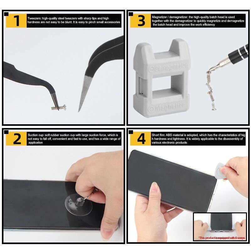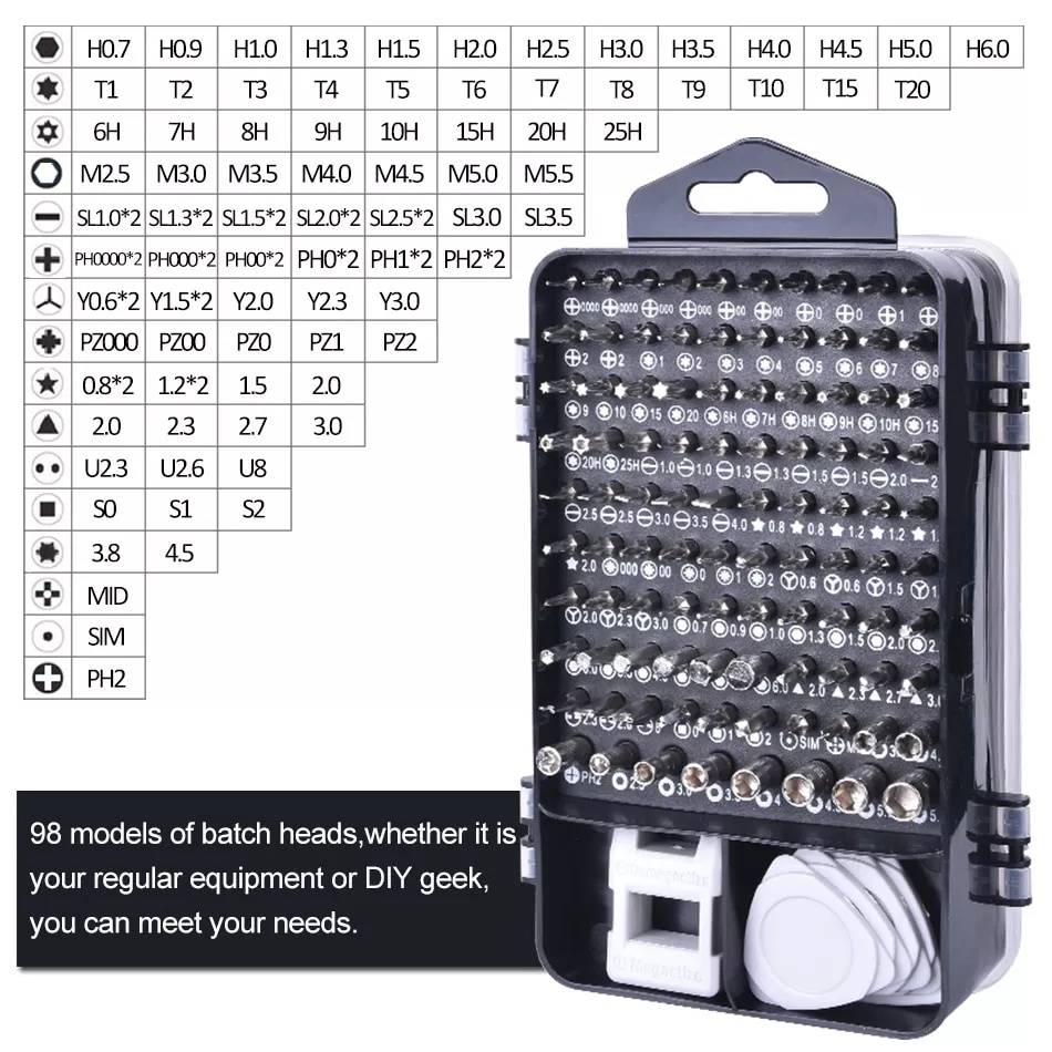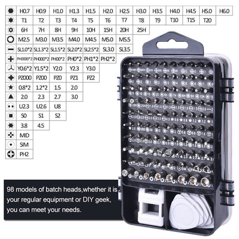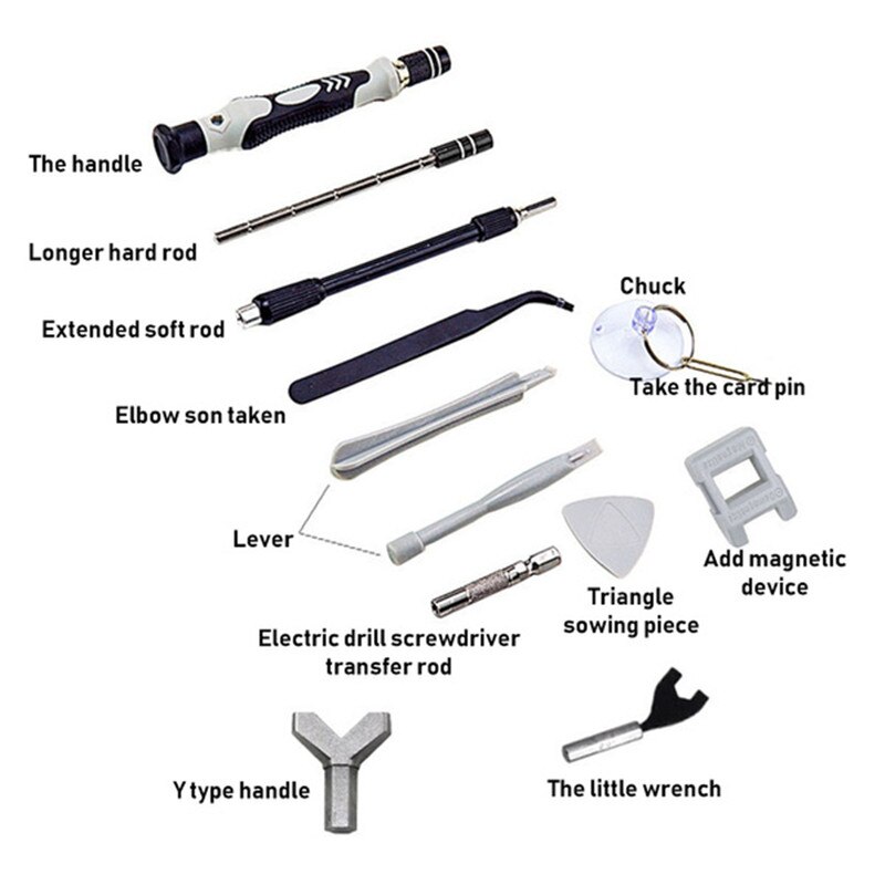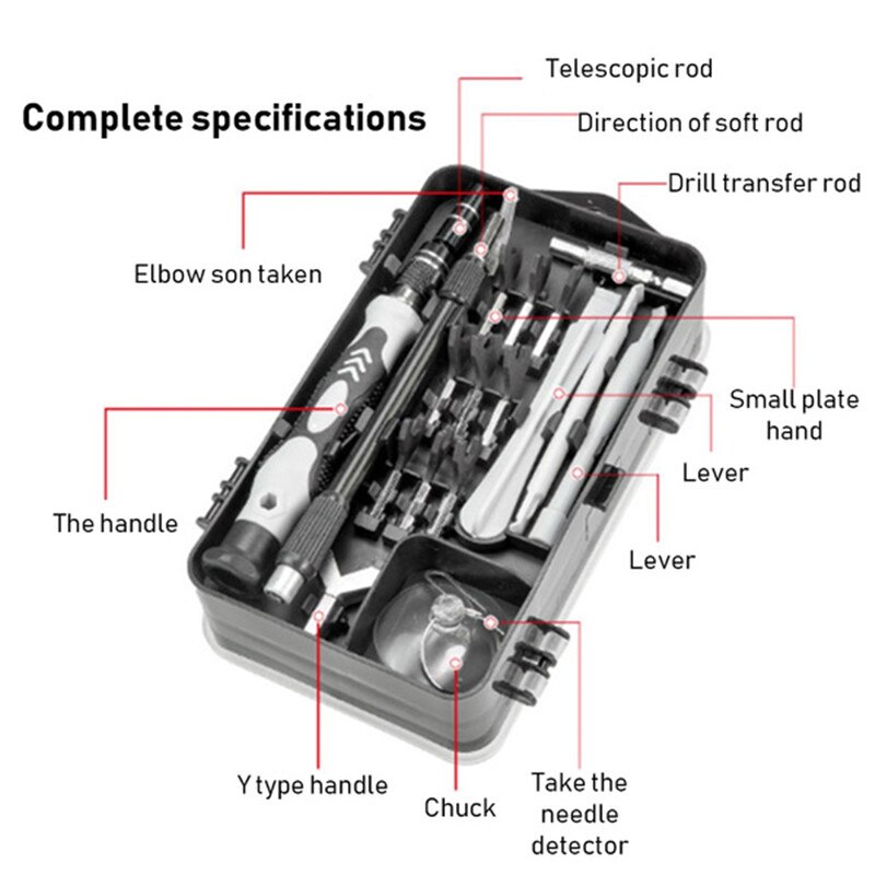 Screwdriver head *98 warping plate *6 magnet *1 Tweezers *1 Handle *1 Extension rod * 10,000 universal hose *1 Pry bar *3 Sucker *1 Clip needle *1 Converter head *1 storage box *1
