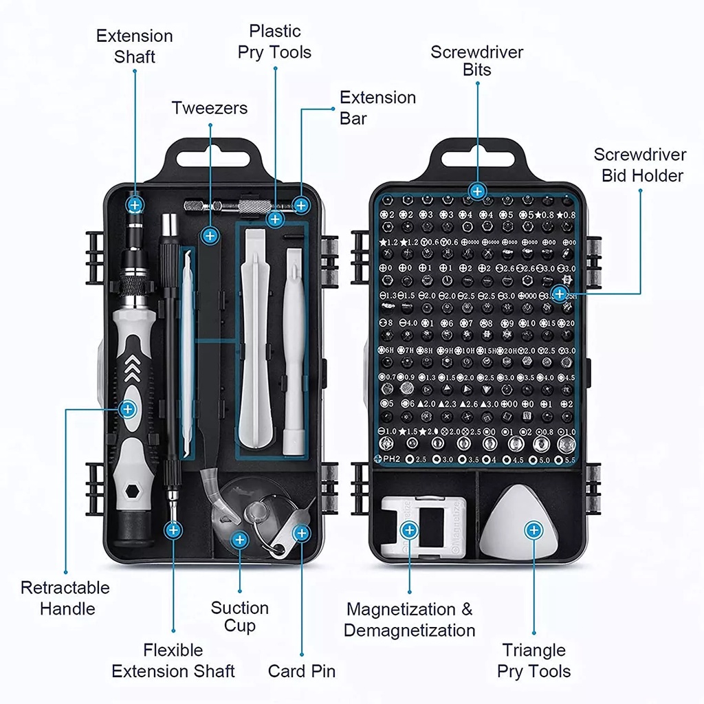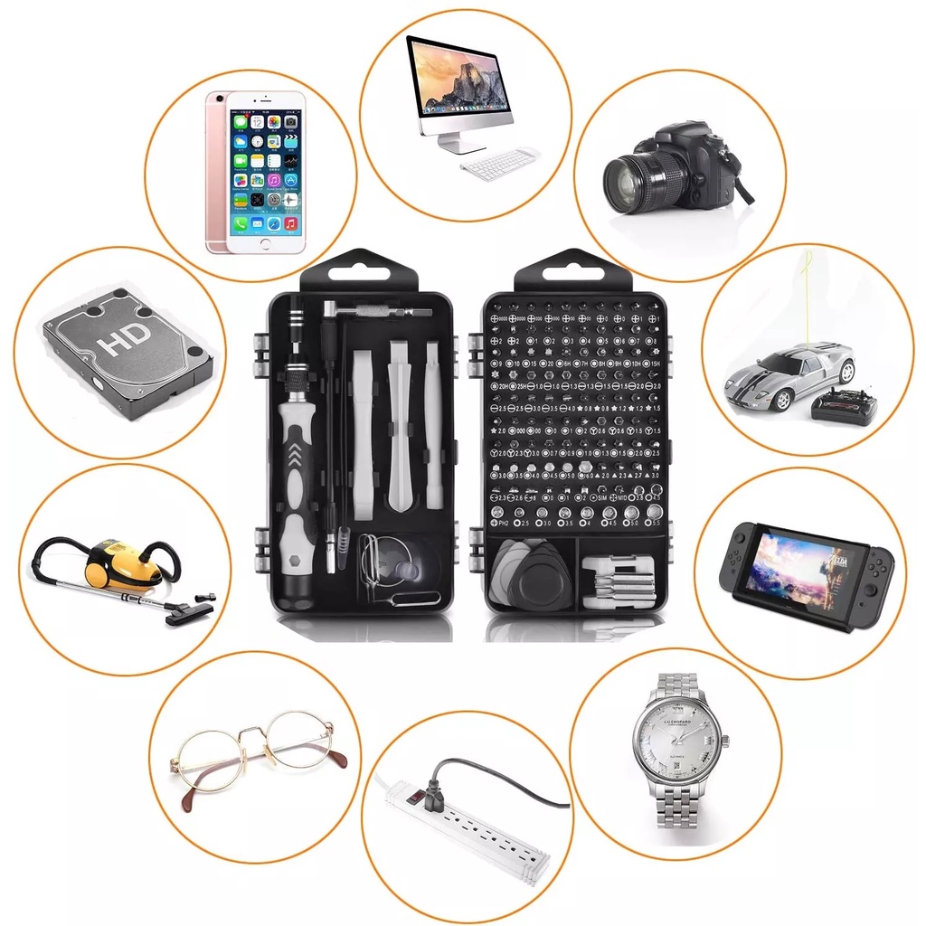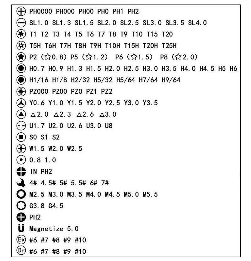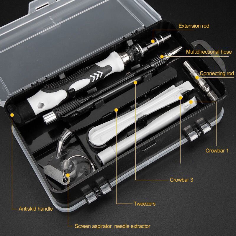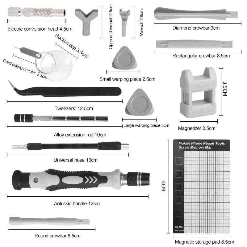 Screwdriver head *98 warping plate *6 magnet *1 Tweezers *1 Handle *1 Extension rod * 10,000 universal hose *1 Pry bar *3 Sucker *1 Clip needle *1 Converter head *1 storage box *1