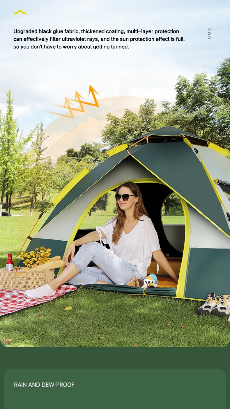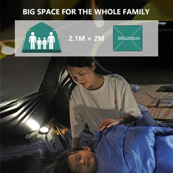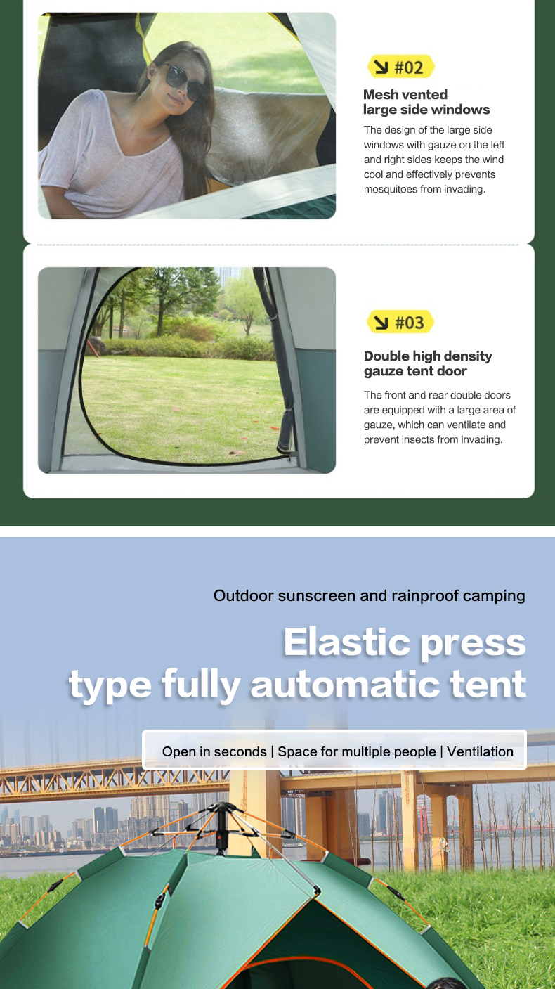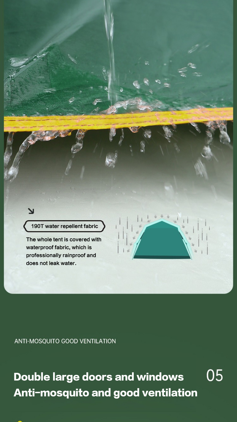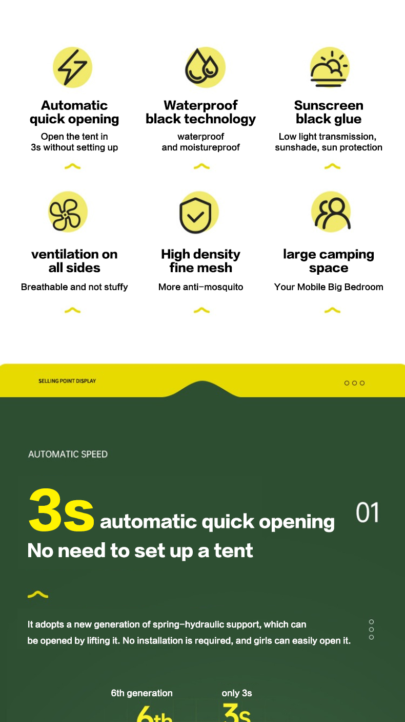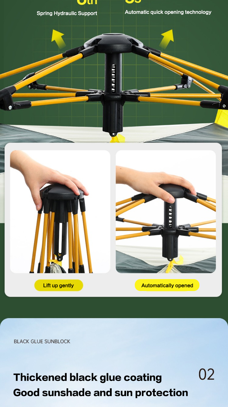Automatic quick open, 3 seconds quick open without building, waterproof and moisture-proof, black rubber sunscreen, low light-transmitting shade sunscreen, ventilation on all sides, breathable not stuffy, high-density fine mesh screen, more resistant to small mosquitoes, camping large space, your mobile big bedroom
