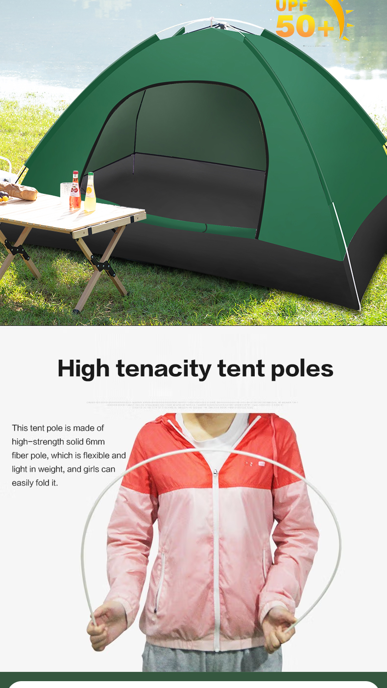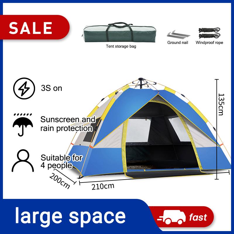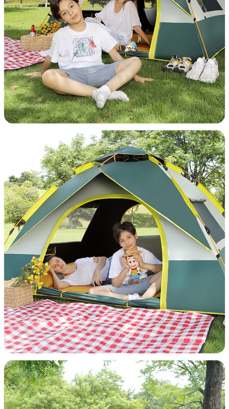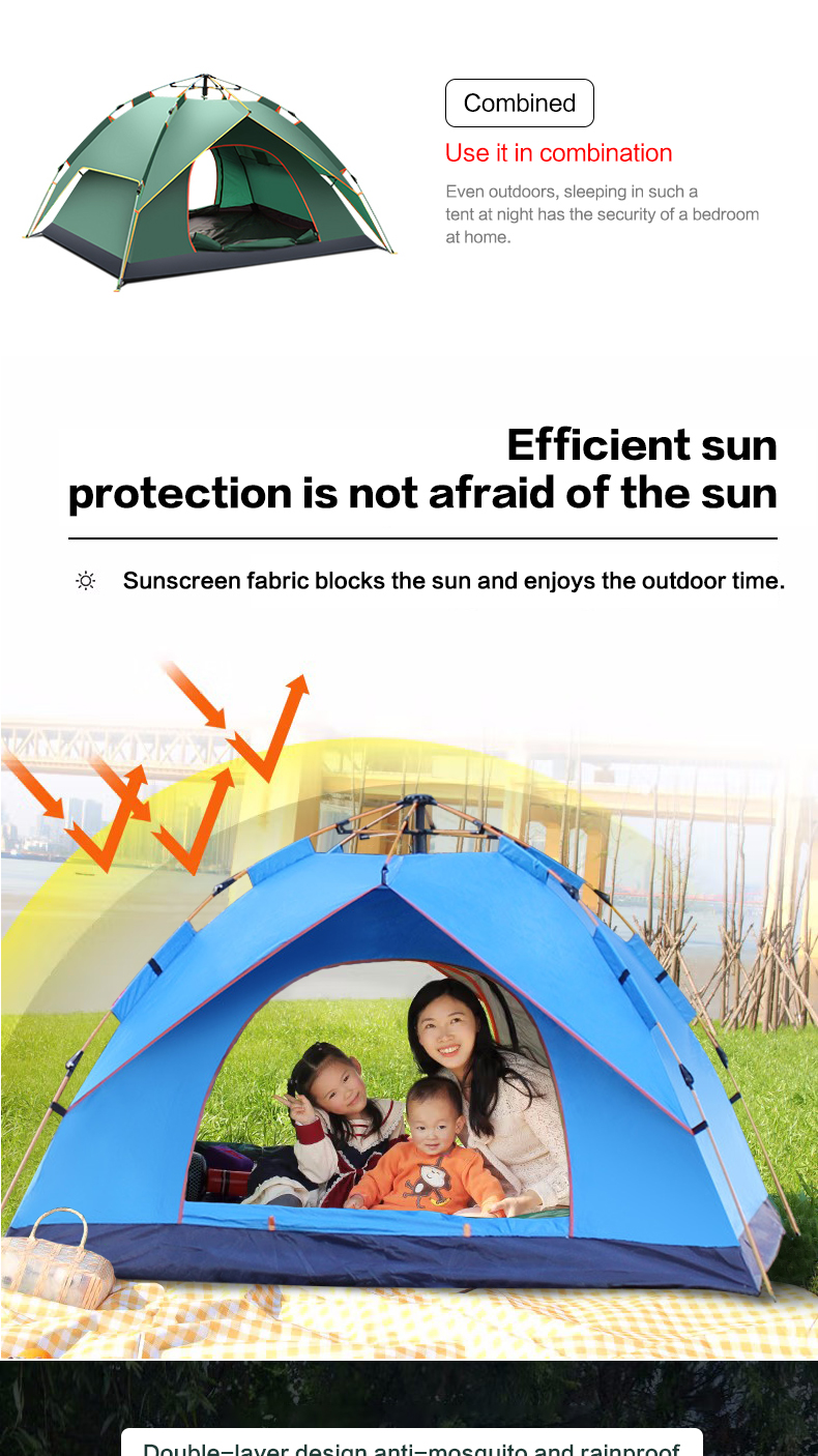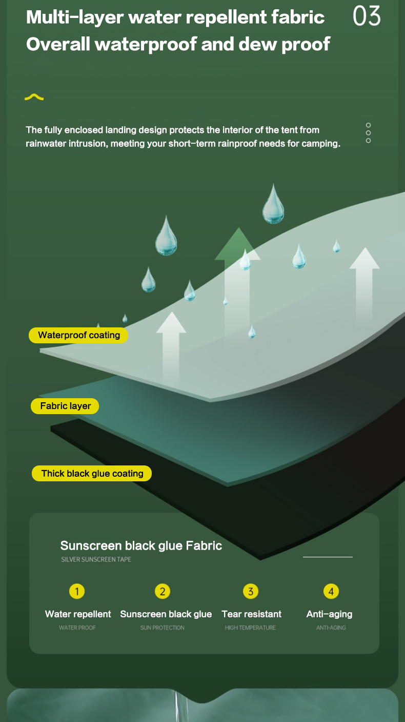 Automatic quick open, 3 seconds quick open without building, waterproof and moisture-proof, black rubber sunscreen, low light-transmitting shade sunscreen, ventilation on all sides, breathable not stuffy, high-density fine mesh screen, more resistant to small mosquitoes, camping large space, your mobile big bedroom