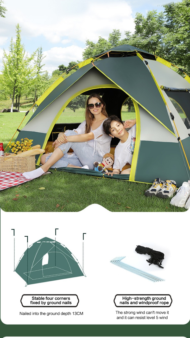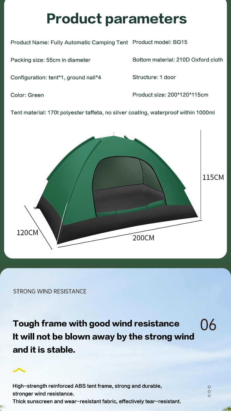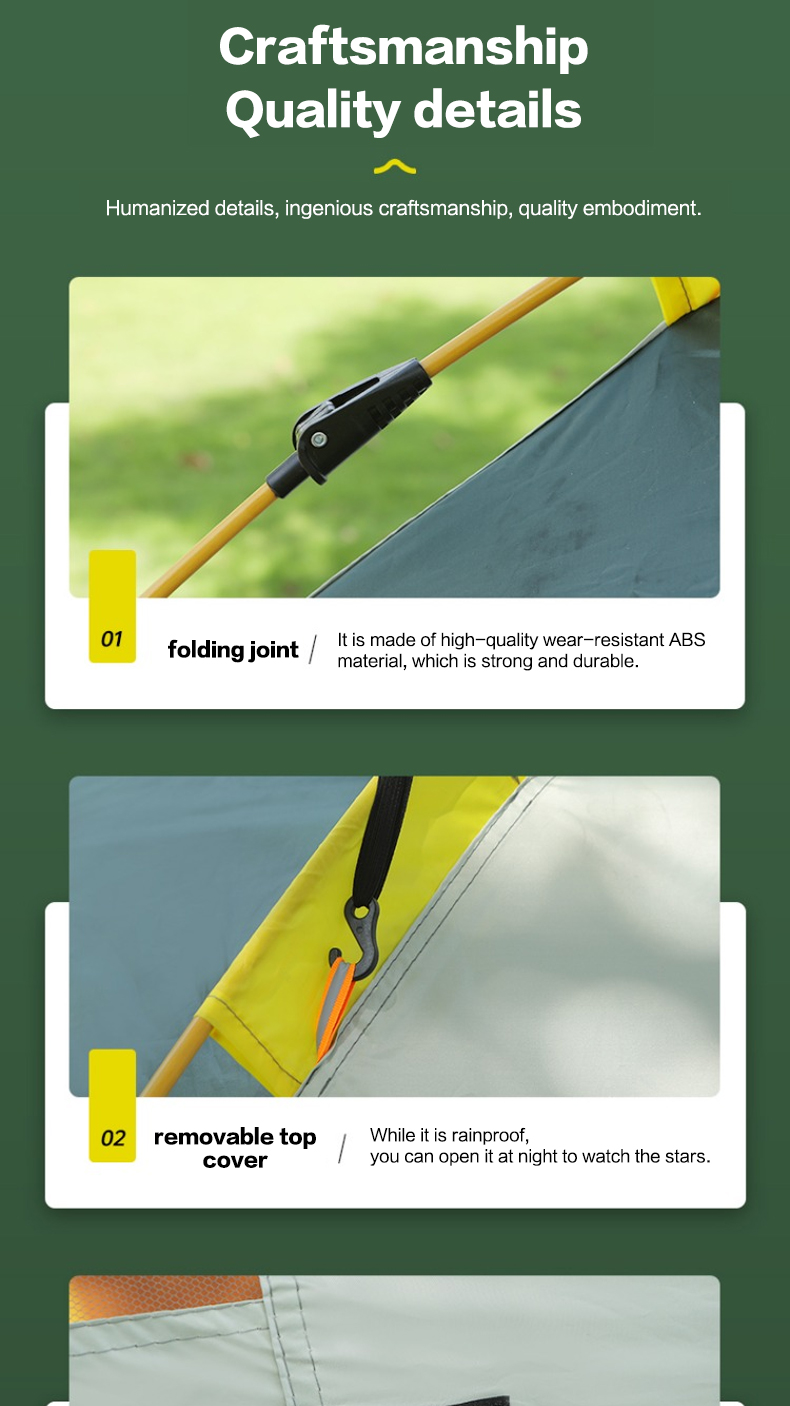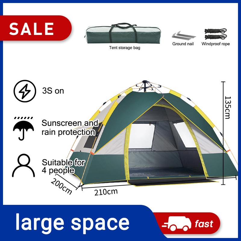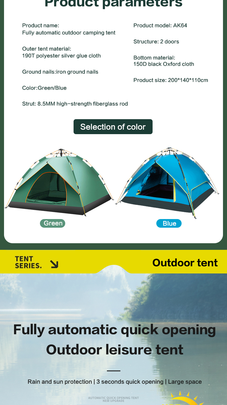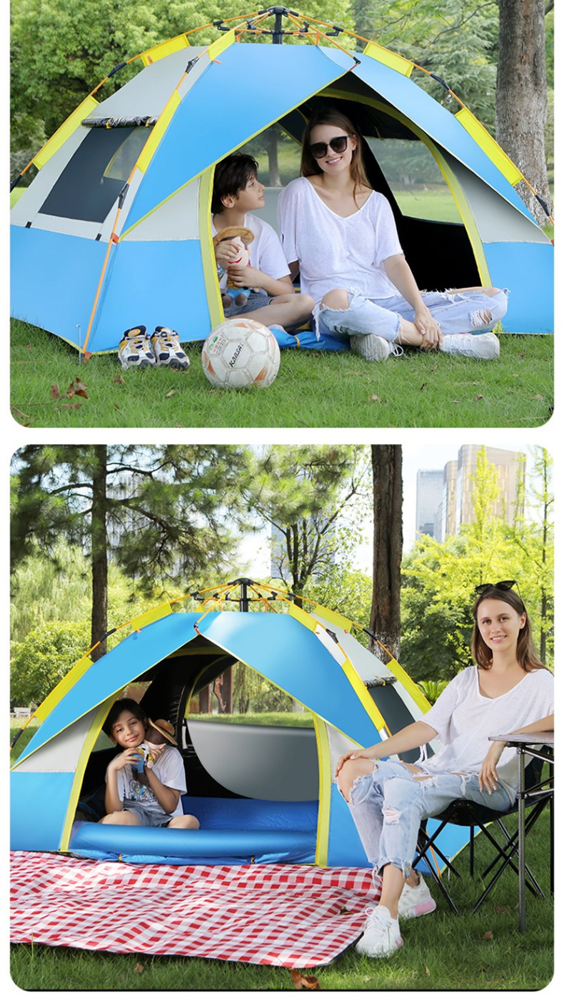 Automatic quick open, 3 seconds quick open without building, waterproof and moisture-proof, black rubber sunscreen, low light-transmitting shade sunscreen, ventilation on all sides, breathable not stuffy, high-density fine mesh screen, more resistant to small mosquitoes, camping large space, your mobile big bedroom