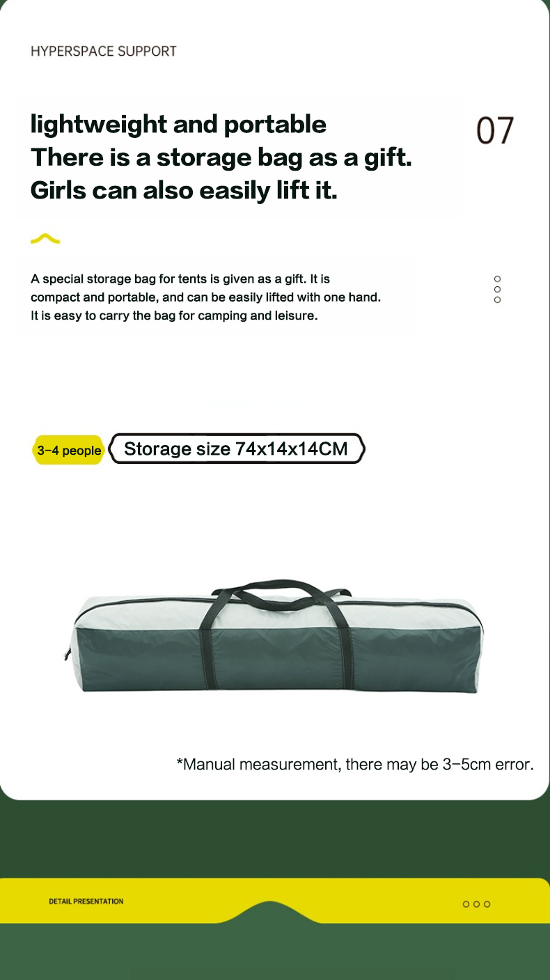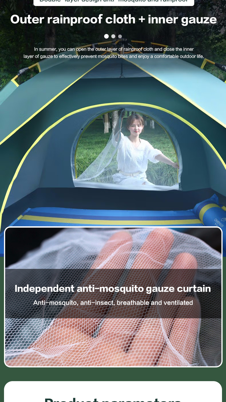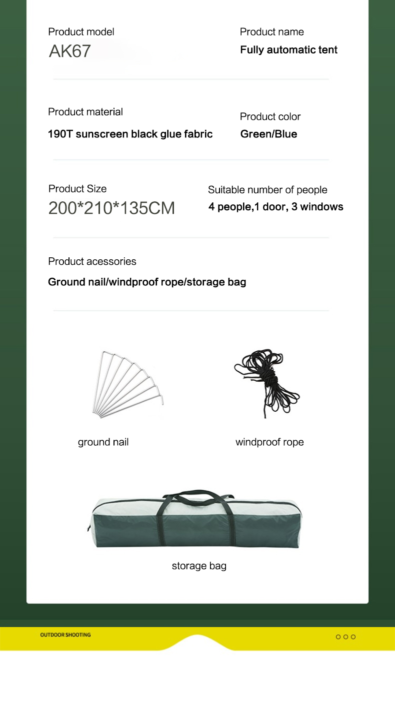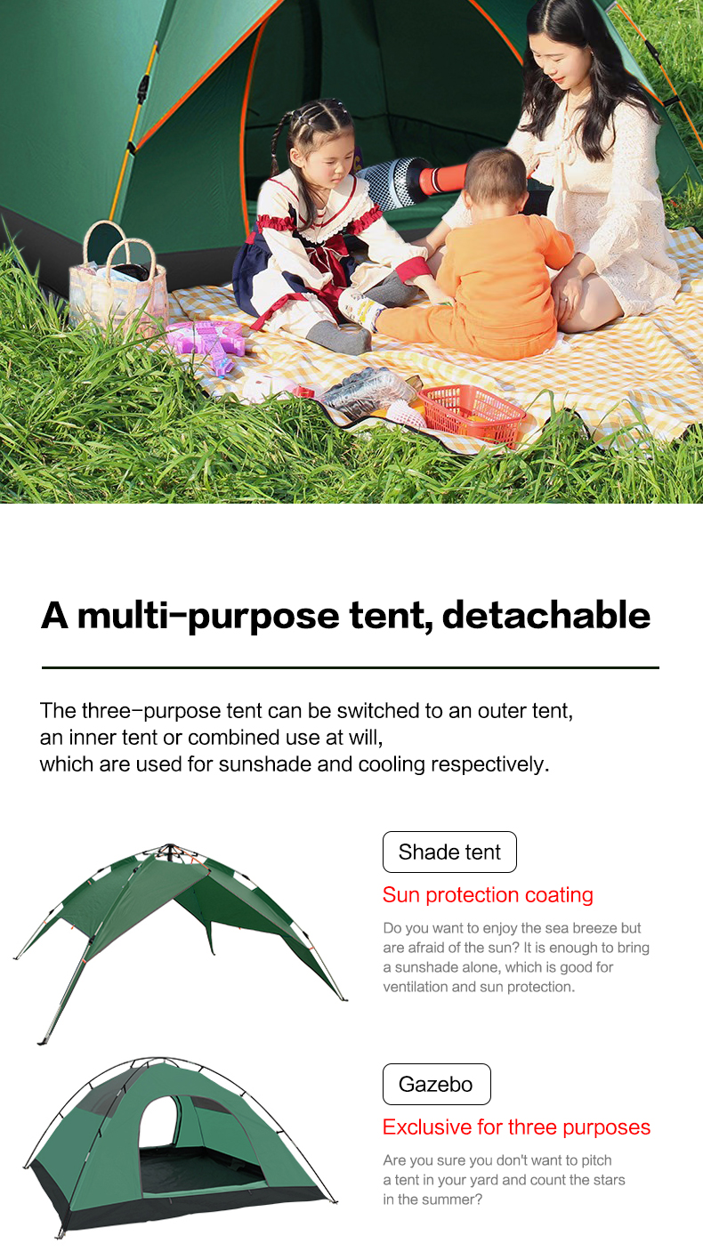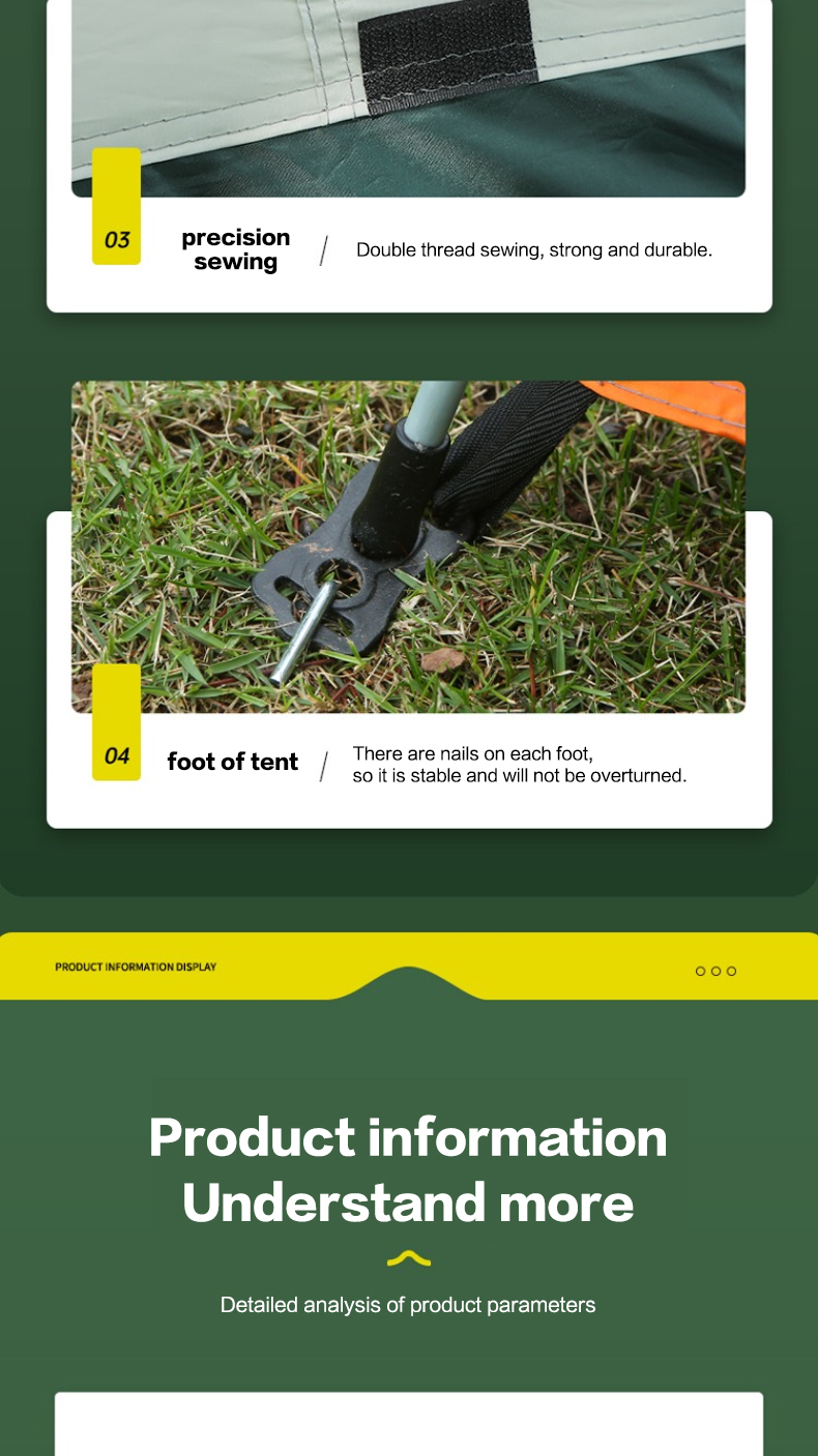 Automatic quick open, 3 seconds quick open without building, waterproof and moisture-proof, black rubber sunscreen, low light-transmitting shade sunscreen, ventilation on all sides, breathable not stuffy, high-density fine mesh screen, more resistant to small mosquitoes, camping large space, your mobile big bedroom
